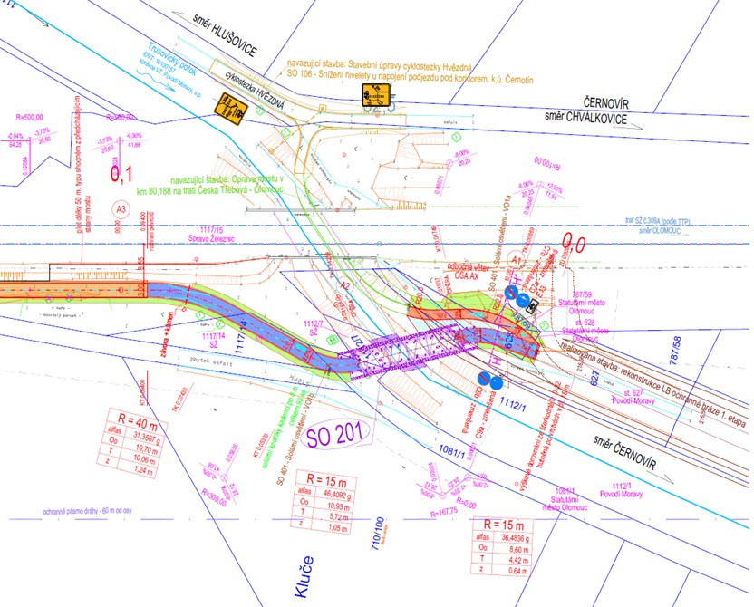 Rovněž spolupracujeme se SŽ při projektování cyklistických komunikací, které se dotýkají pozemků SŽ. Právě nyní se buduje cyklistický koridor Olomouc – Štěpánov s odbočkou na Hlušovice a Bohuňovice, kde je nutné převést cyklistickou dopravu pod železničním koridorem Olomouc – Zábřeh. Podrobnosti jsou k dispozici zde.